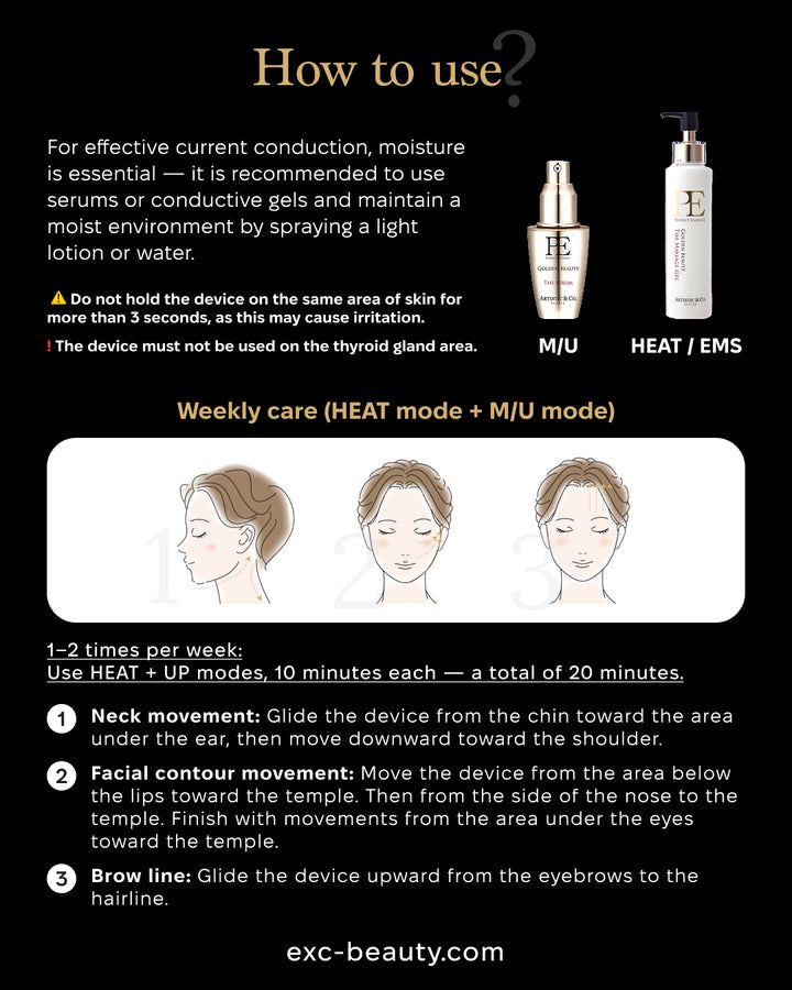 Mid-frequency pulses deliver a rhythmical stimulation that mimics a professional aesthetic massage.