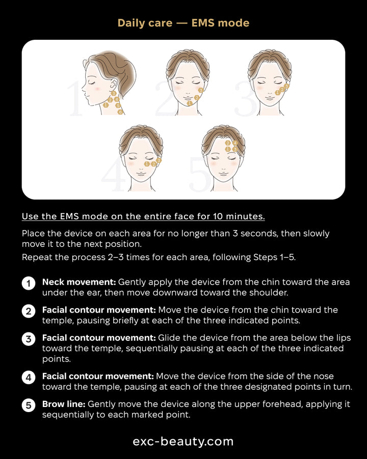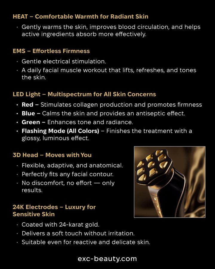EMS (Electrical Muscle Stimulation) lifts and firms deep facial muscles, enhancing cheekbones and jawline definition.